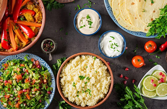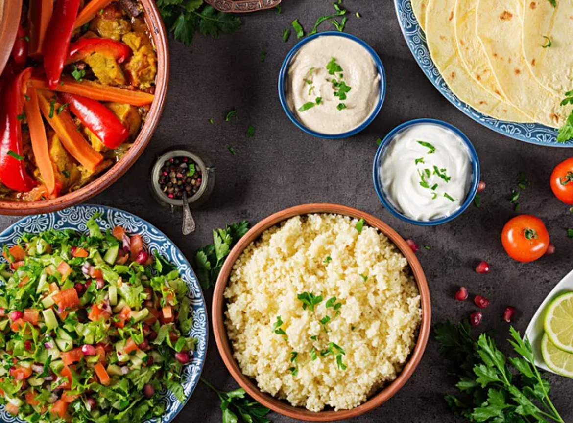 The starters (a selection of Tunisian mezzes) and desserts will be served at your table. Then, you can head to the buffet to choose from a variety of grilled dishes, including meats, chicken, and shrimp. The chef will prepare your grilled order accompanied by grilled vegetables, potatoes, and rice.